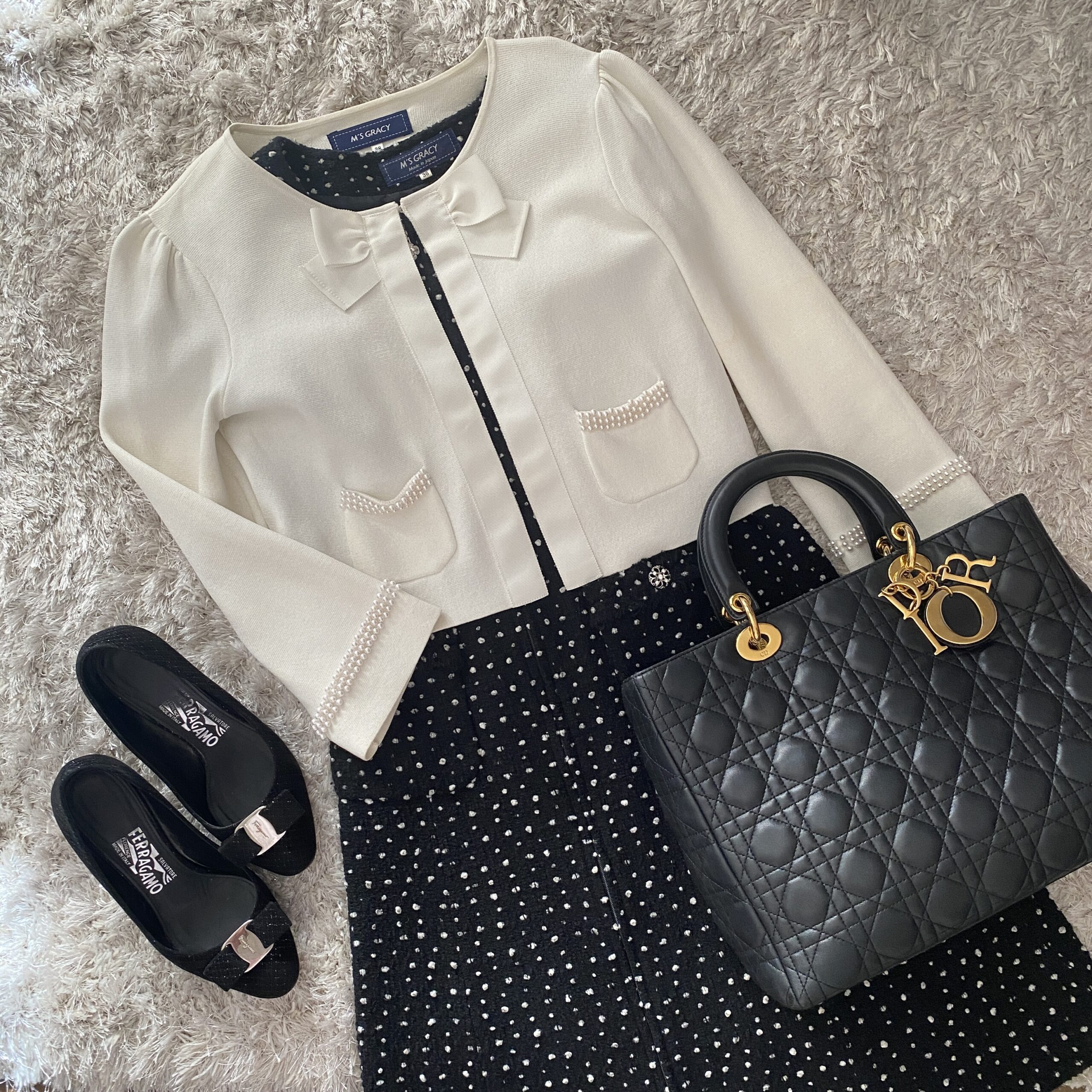 パールが付いた真っ白のカーディガンで、更にかっちり度アップ!