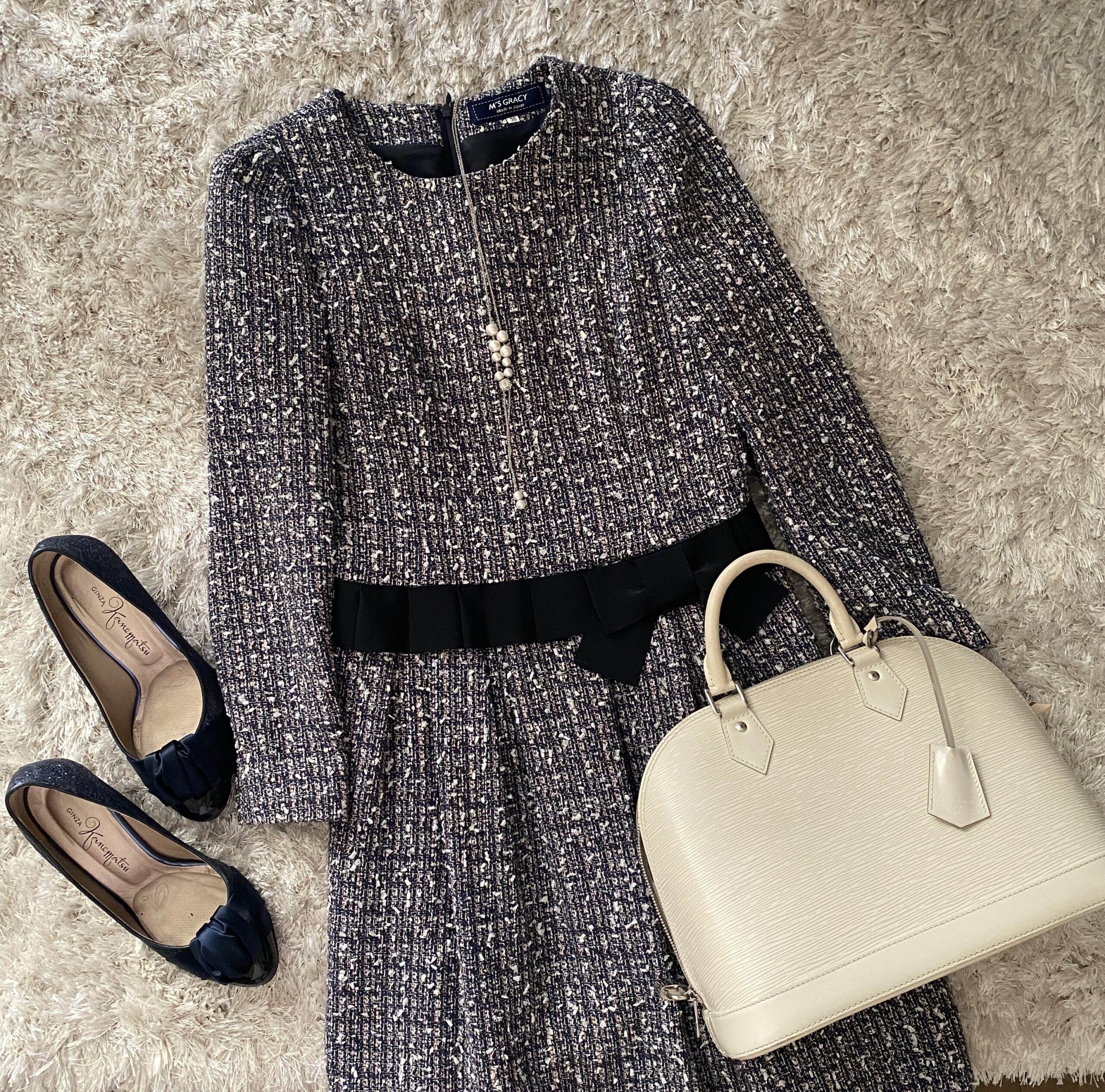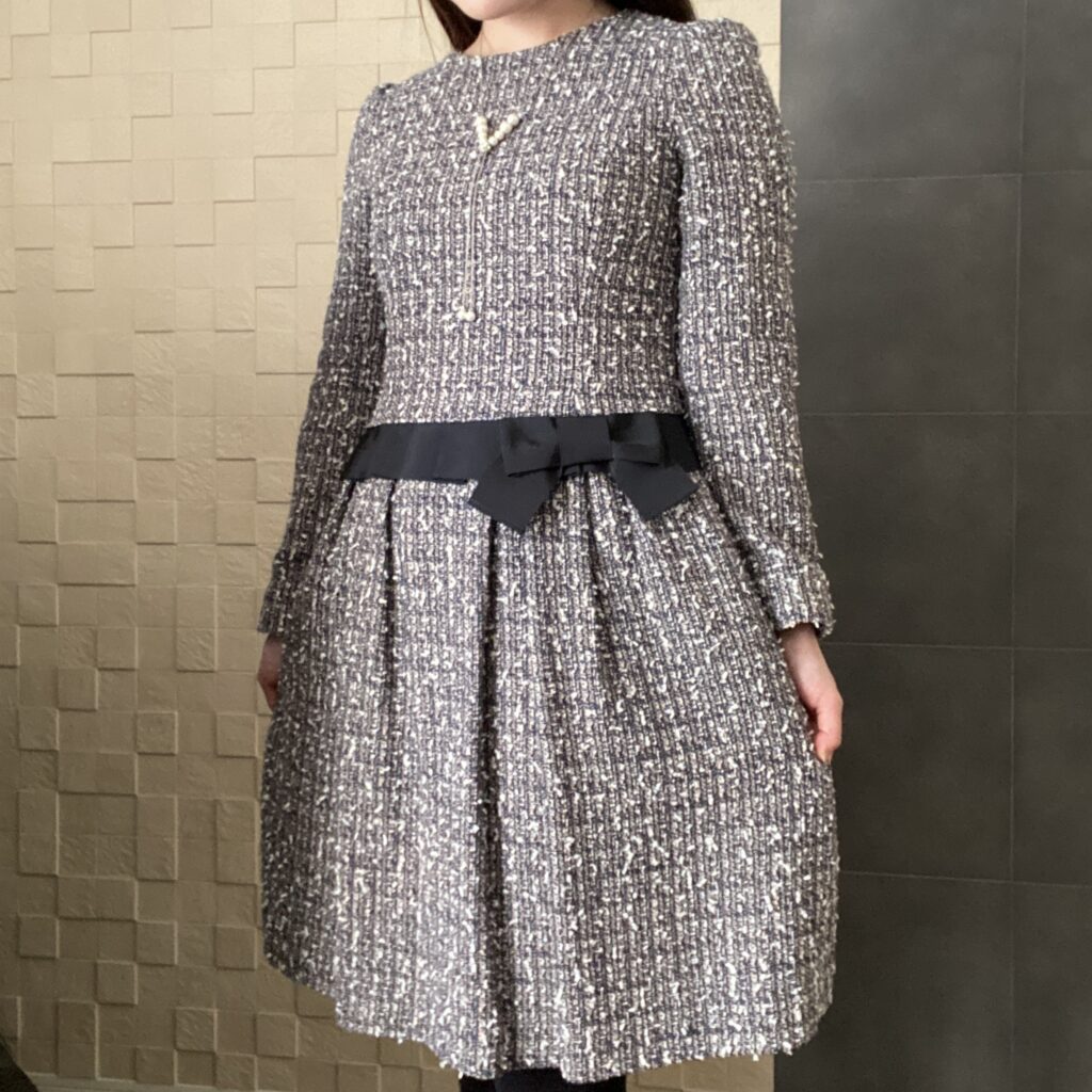 しっかりとしたツイード素材で、腰のリボンがエムズグレイシーらしいデザインです。