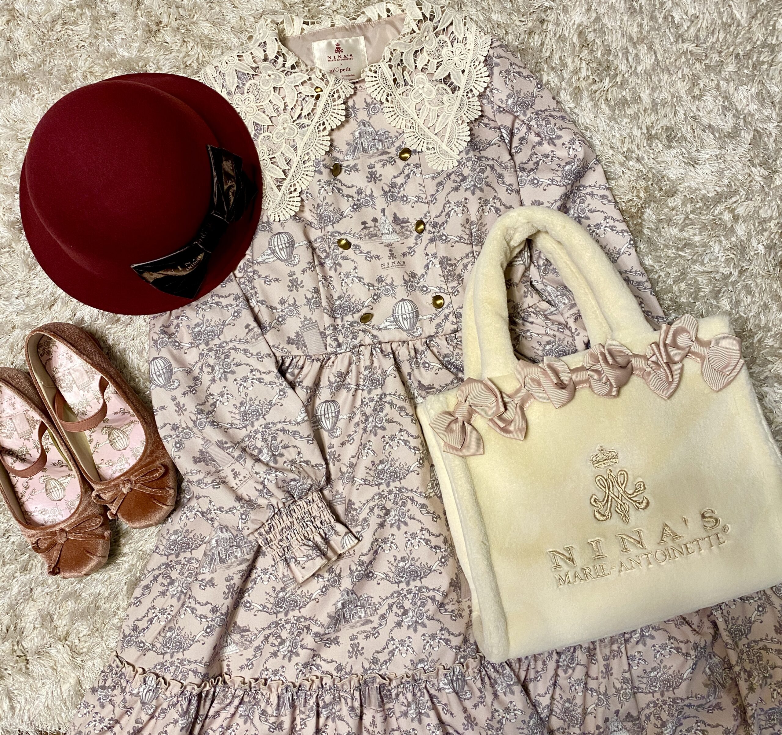 靴はピンクのベロア素材で、鞄のグログランリボンのピンクと合わせて甘さがアップされて可愛いの渋滞ですね。