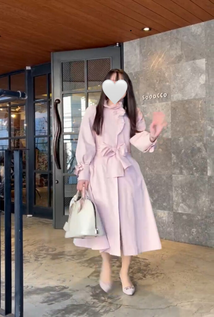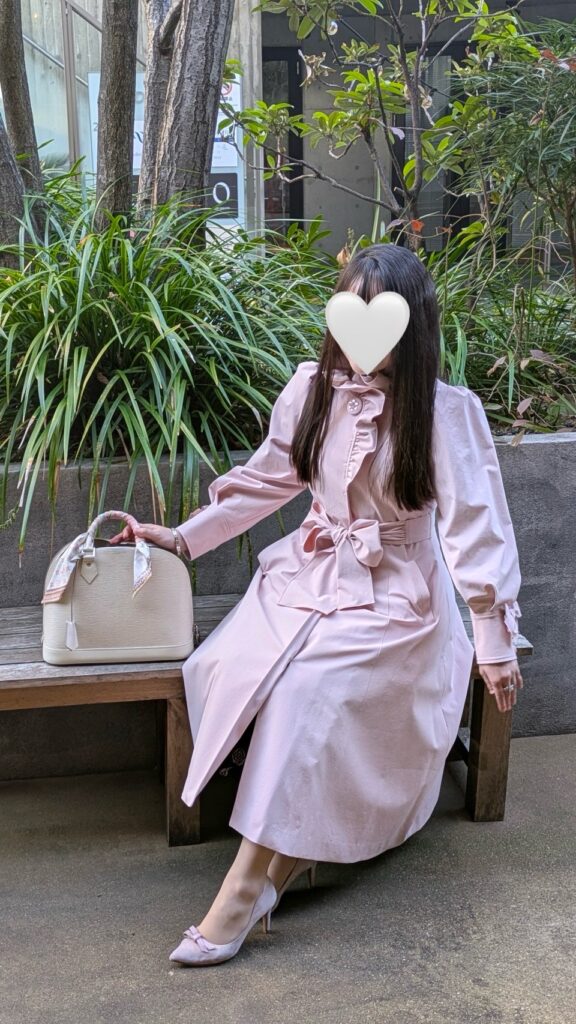 私のコーデはピンクのトレンチコートに、ピンクのバラが立体的なワンピースで