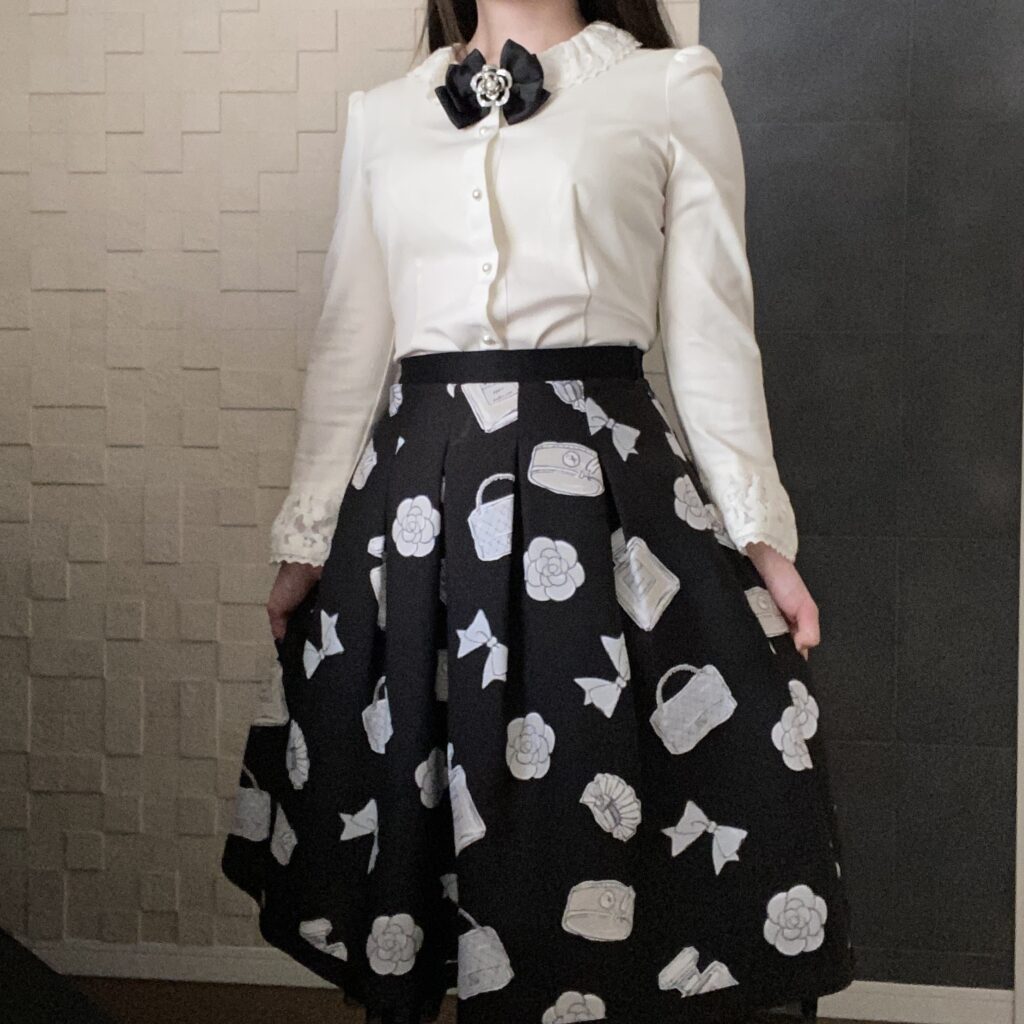ブラウスもスカートも生地は薄手なので、春先にも着たくなるコーデです。