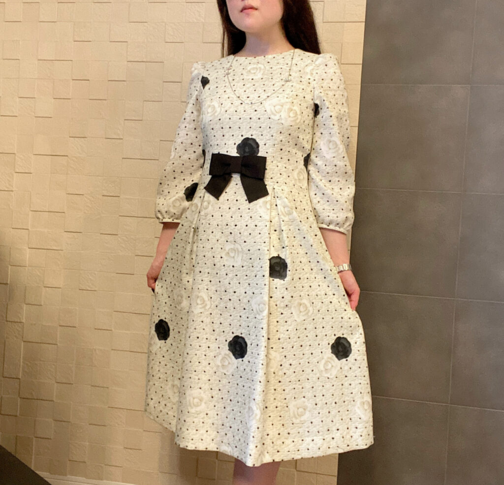 立体的なカメリアと、ドット柄がプリントされており上品なデザイン。