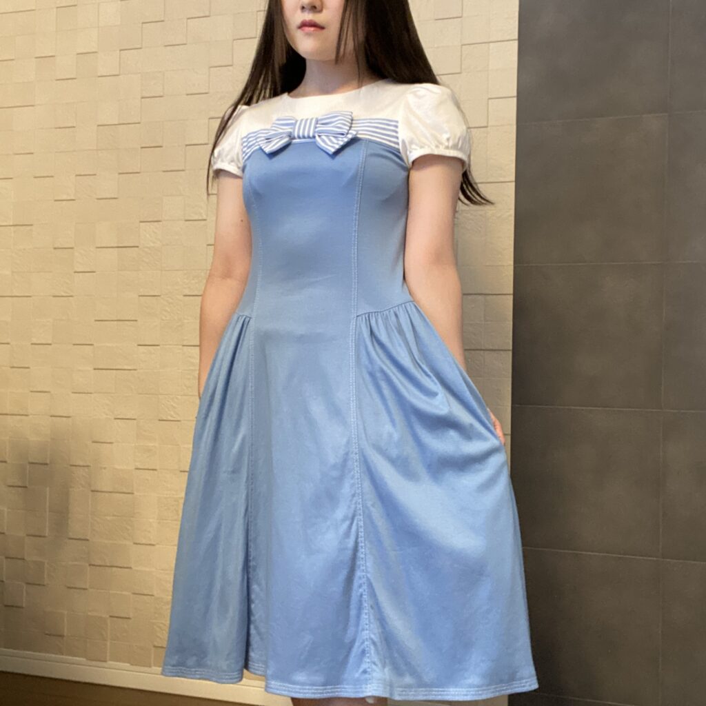 エプロンはないけれど、ブルーの色と広がるAラインスカートがアリスっぽい!