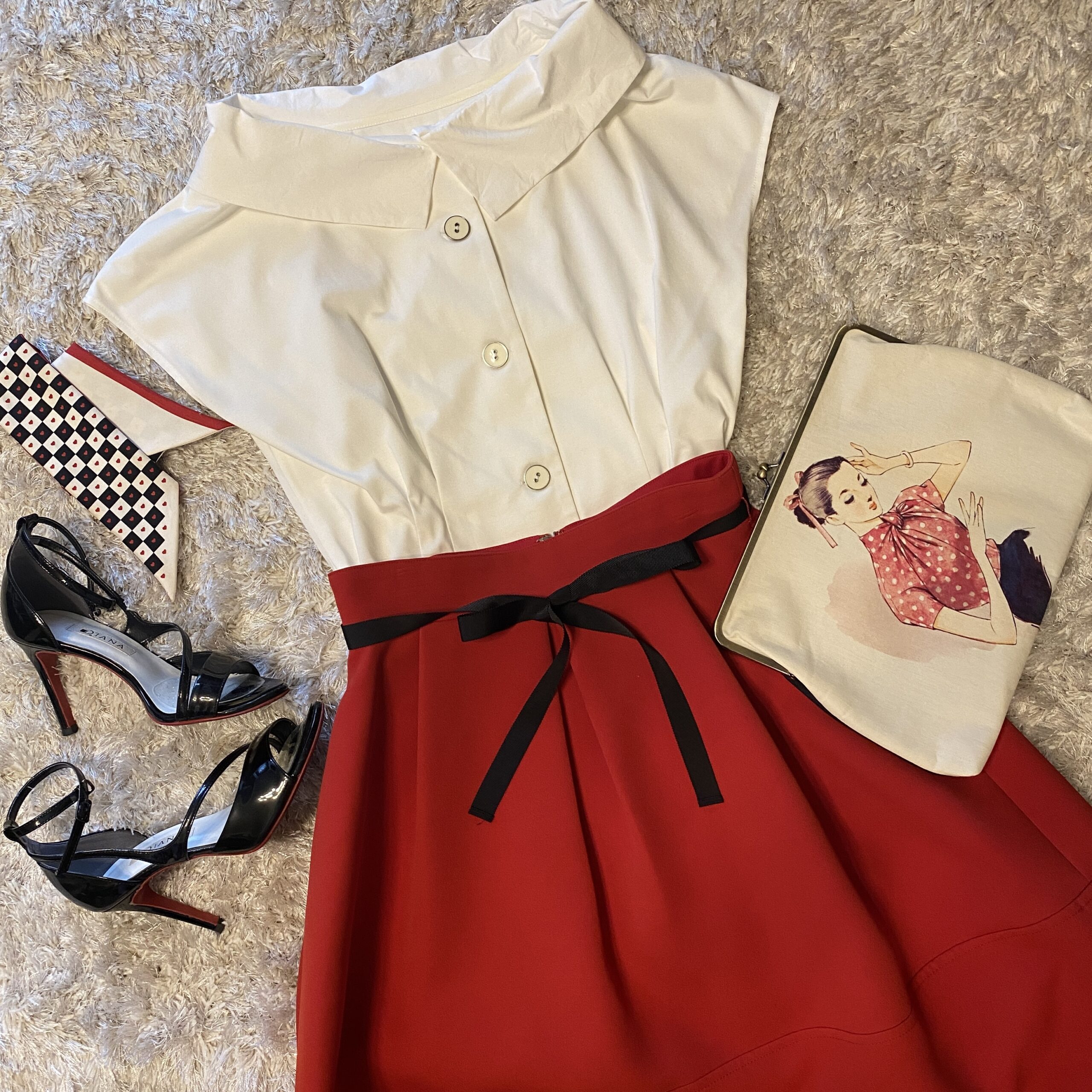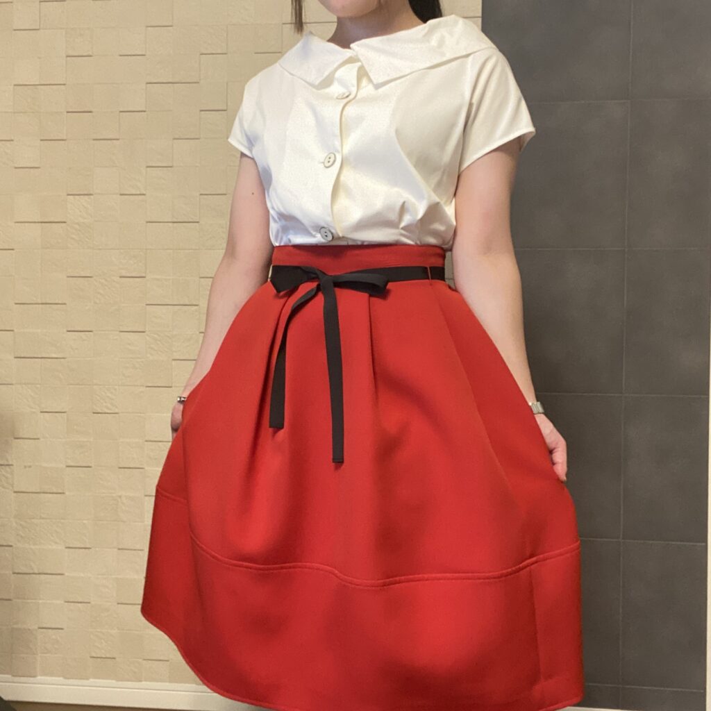 ハイウエストな赤のスカートに、黒のリボンもポイントです。