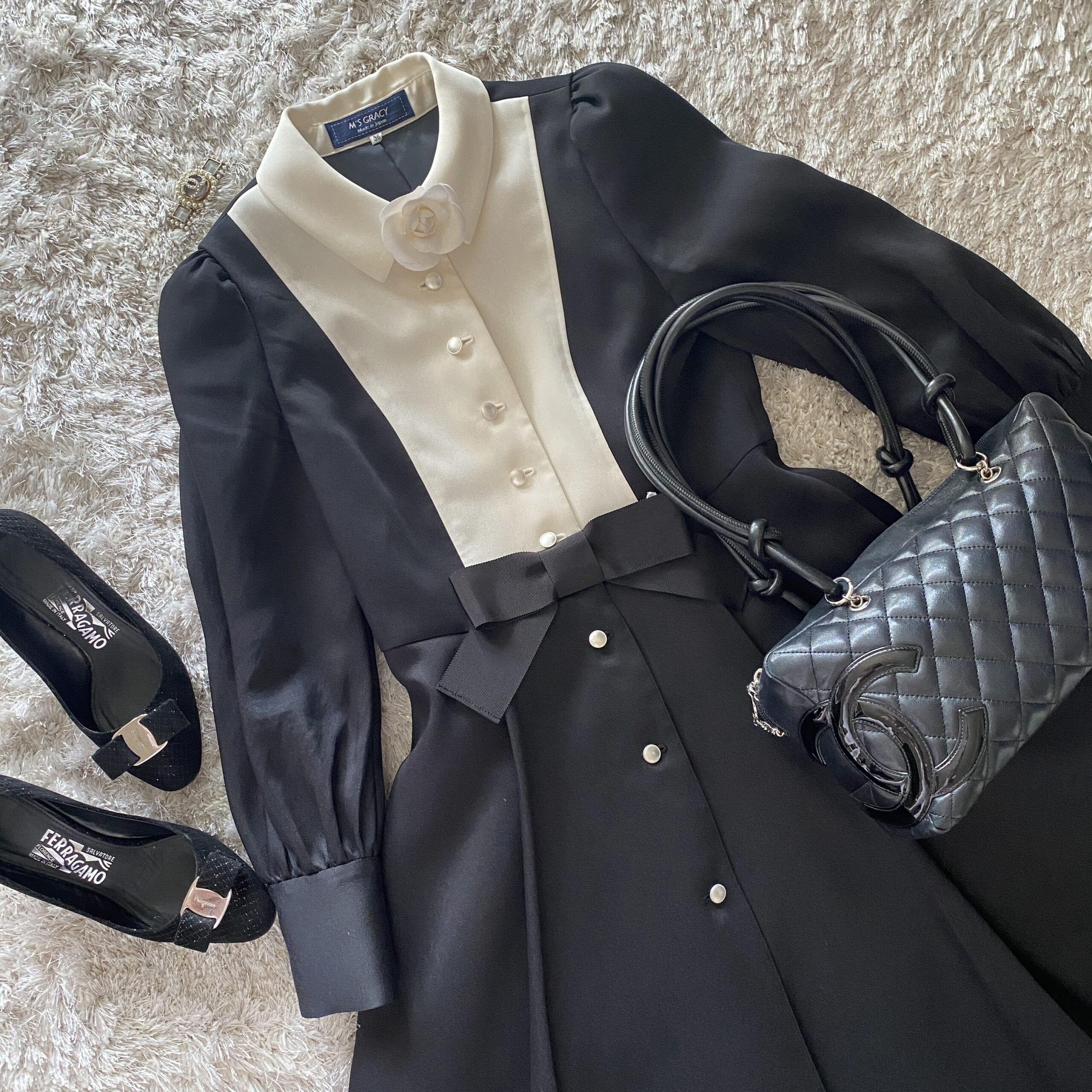 シャネルのブランドモチーフといえば、カメリアなので、エムズグレイシーからモノトーン×カメリアのデザインがまさにシャネルっぽい雰囲気のワンピースを着ました!