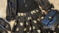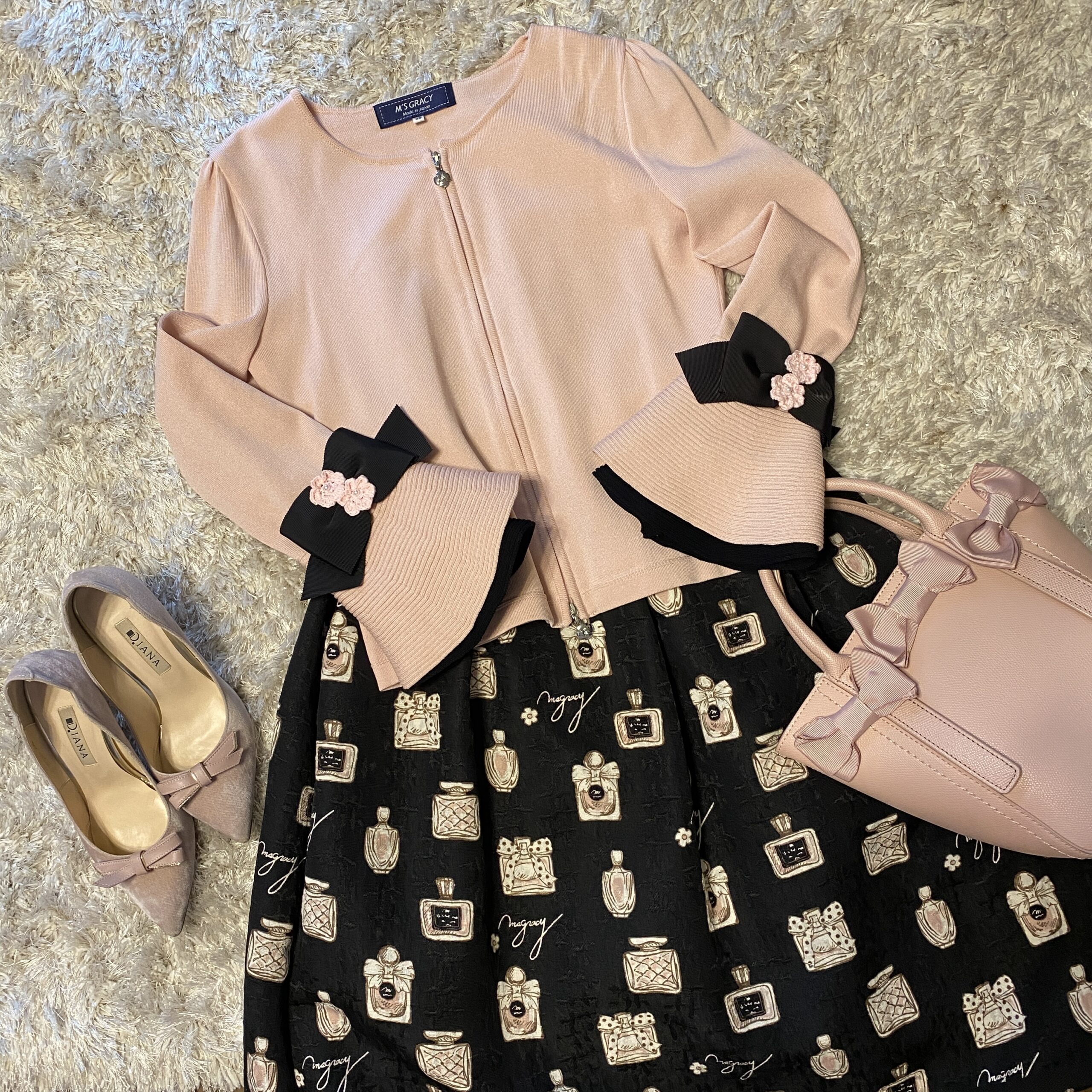 黒字にピンクカラーなので、カーディガンと靴と鞄もピンクにして