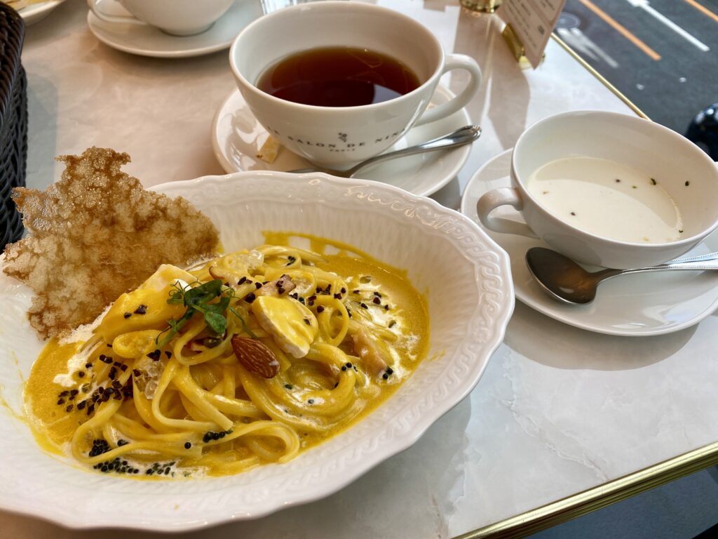 かぼちゃのクリームパスタと、ロイヤルミルクティーのシフォンケーキを食べました。