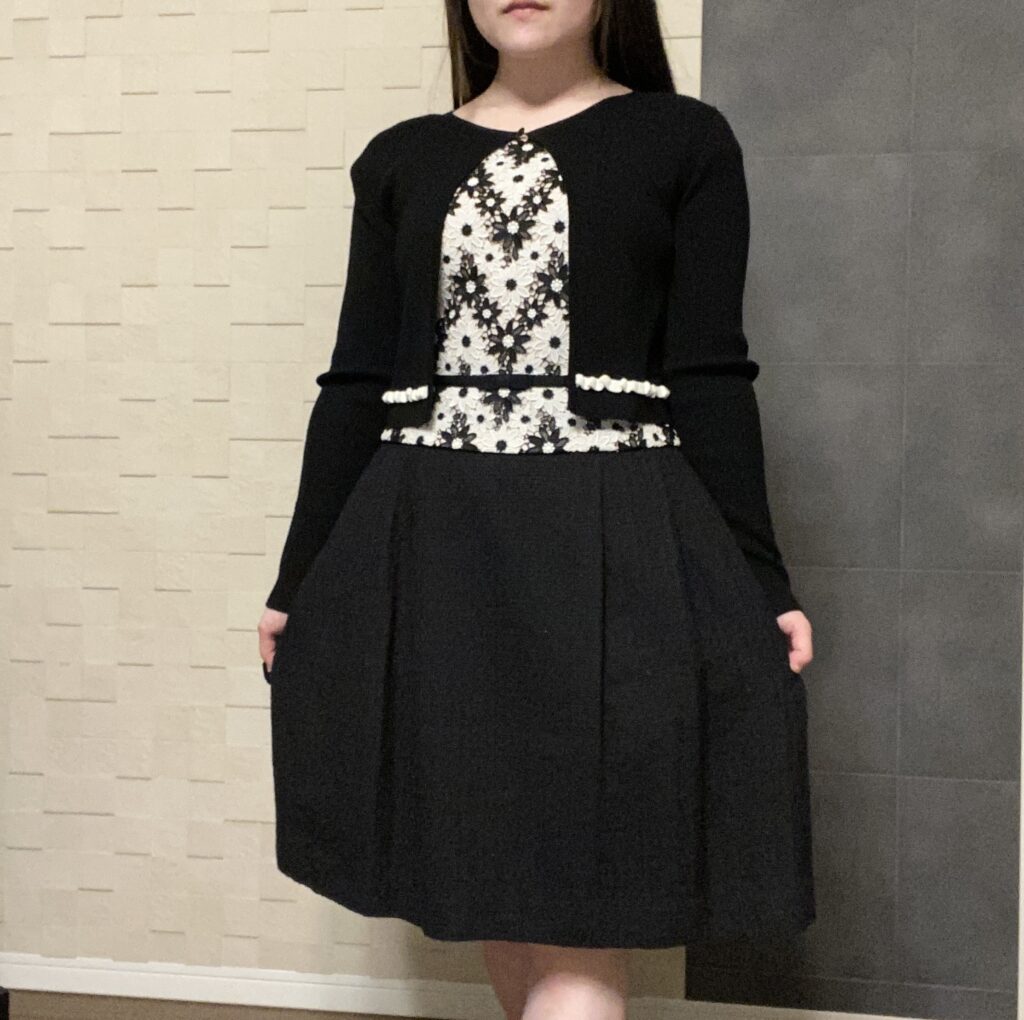 上は花の刺繡がとっても繊細にできているデザイン、下は無地の黒ツイードっぽい生地で