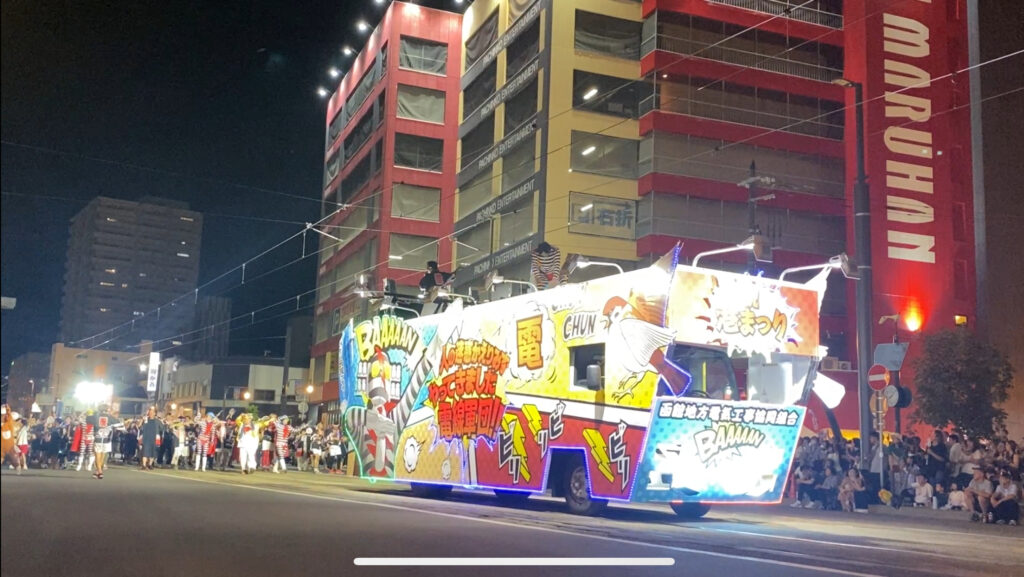 華やかな山車や、いか踊りという音楽に合わせて地元の人たちがパレードするお祭りイベントです。