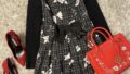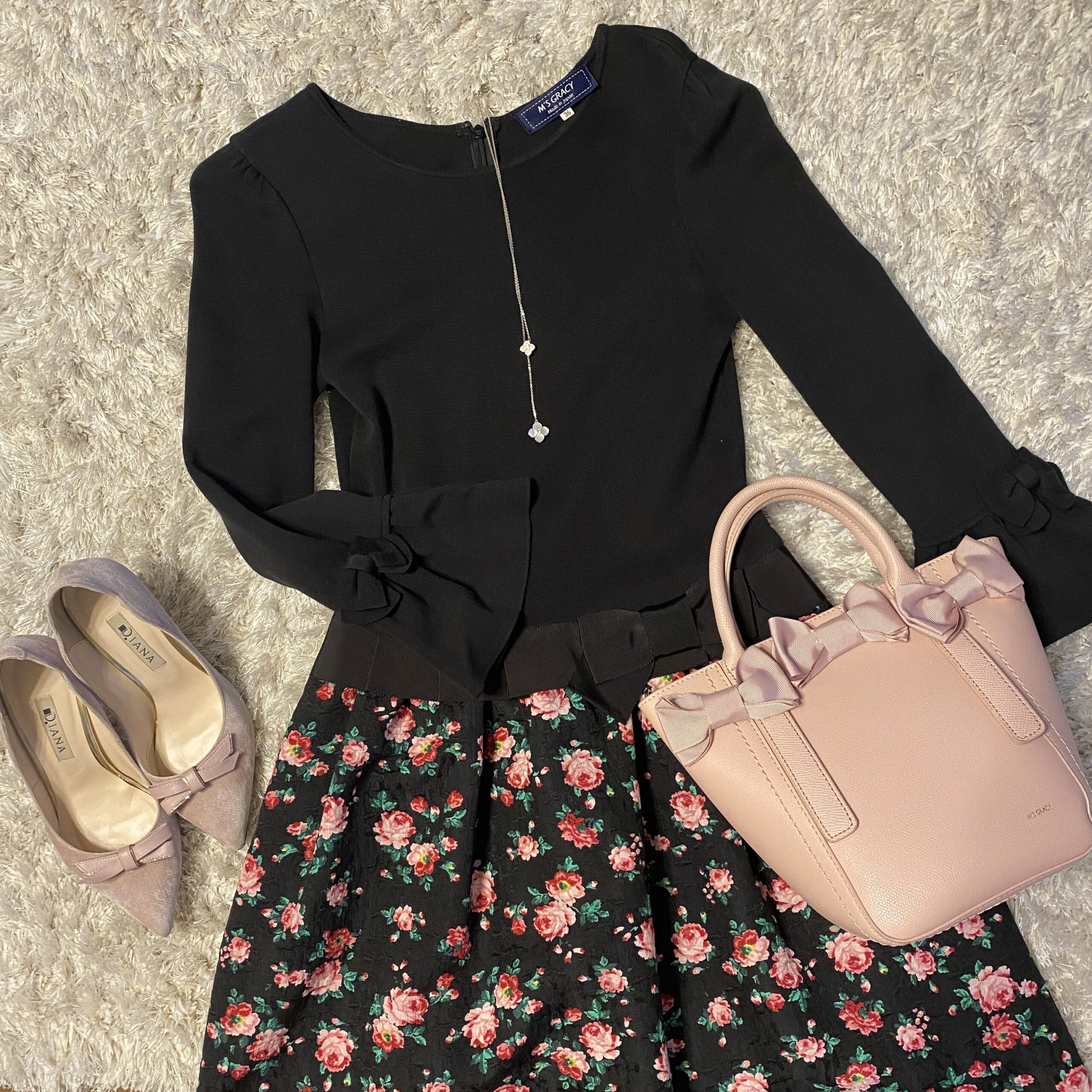鞄と靴は、小花柄の色に合わせてピンクにしました。
